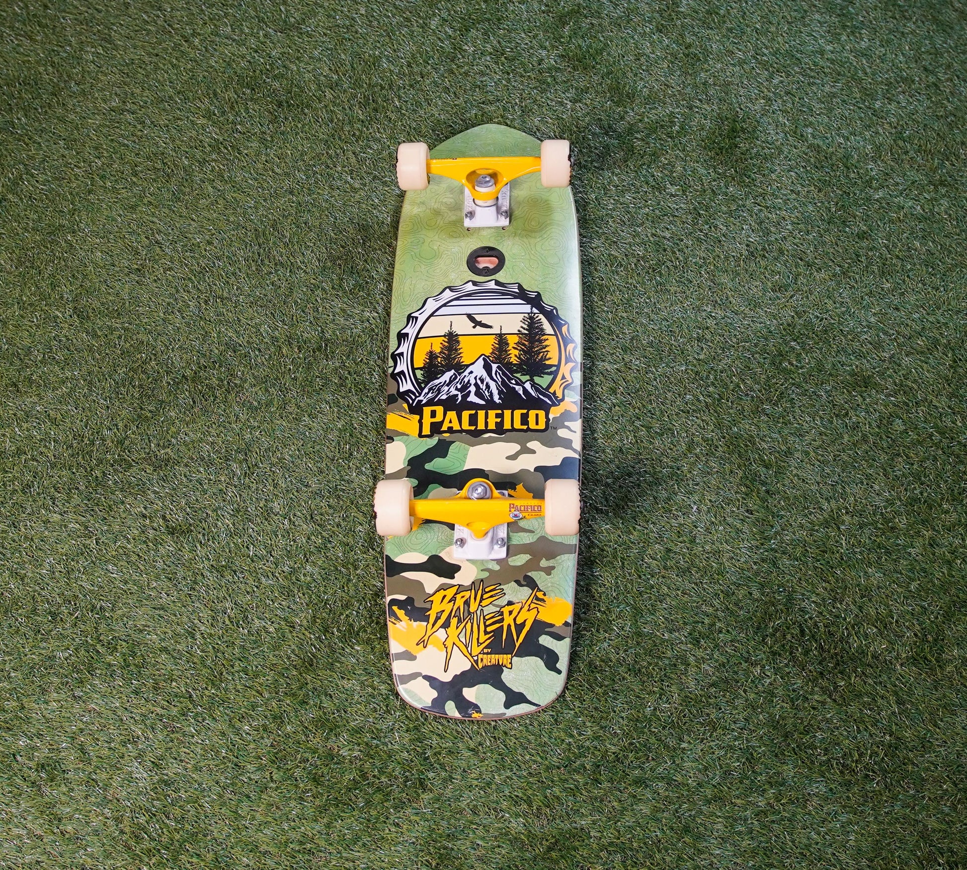 Creature Pacifico 30.7" x 8" Bottle Opener Deck. 54mm x 87a OJ Pacifico Wheels. Abec 3 Bearings. Krux Yellow/White Pacifico Trucks.