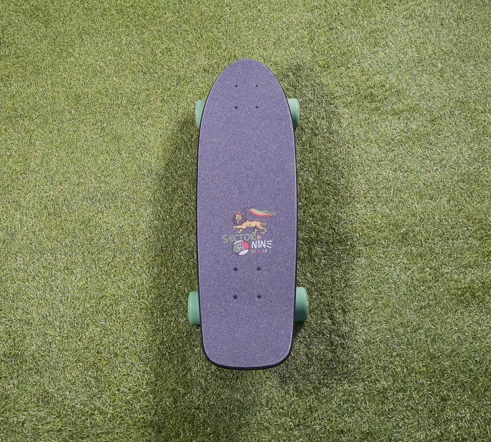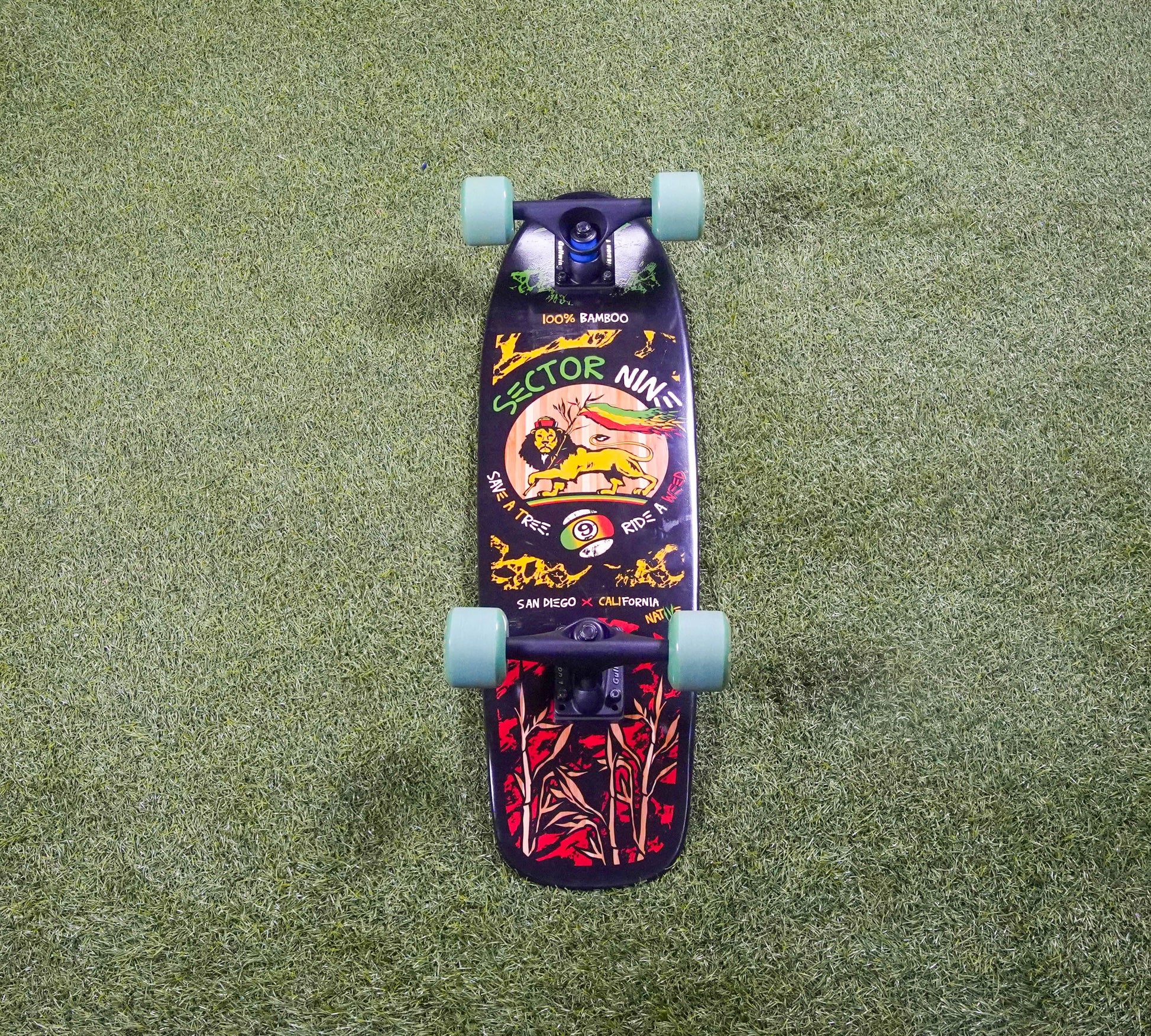 Sector 9 26.5” x 7.5” Bambino Nug Deck. Sector 9 61mm x 78a Nineballs. ABEC 5 Greaseball Bearings. 8.375” Gullwing Mission Trucks.