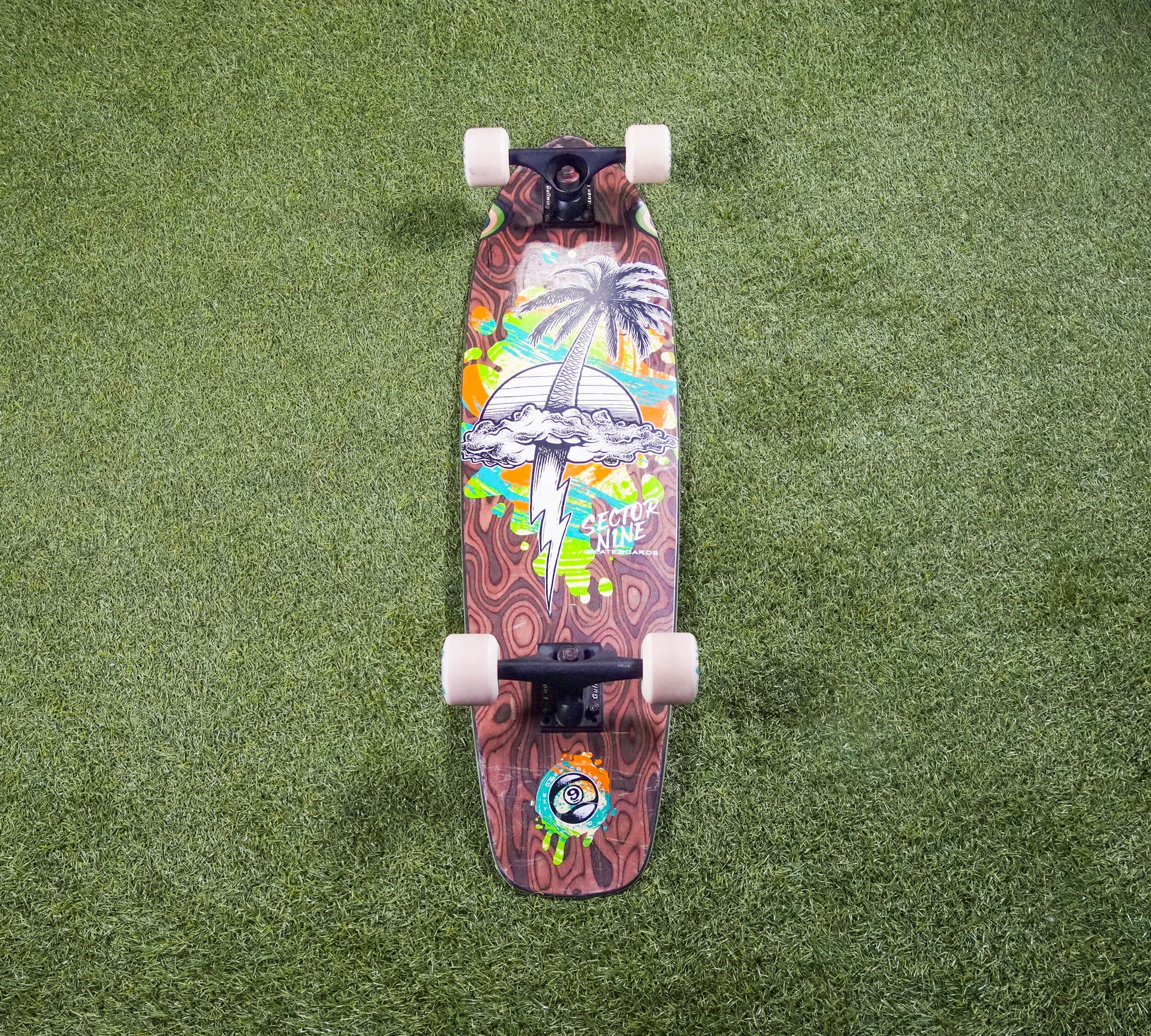 Sector 9 34.0” x 8.7” Strand Squall Deck. Sector 9 61mm x 78a Nineballs Wheels. ABEC 5 Greaseball Bearings. 8.375” Gullwing Mission Trucks.