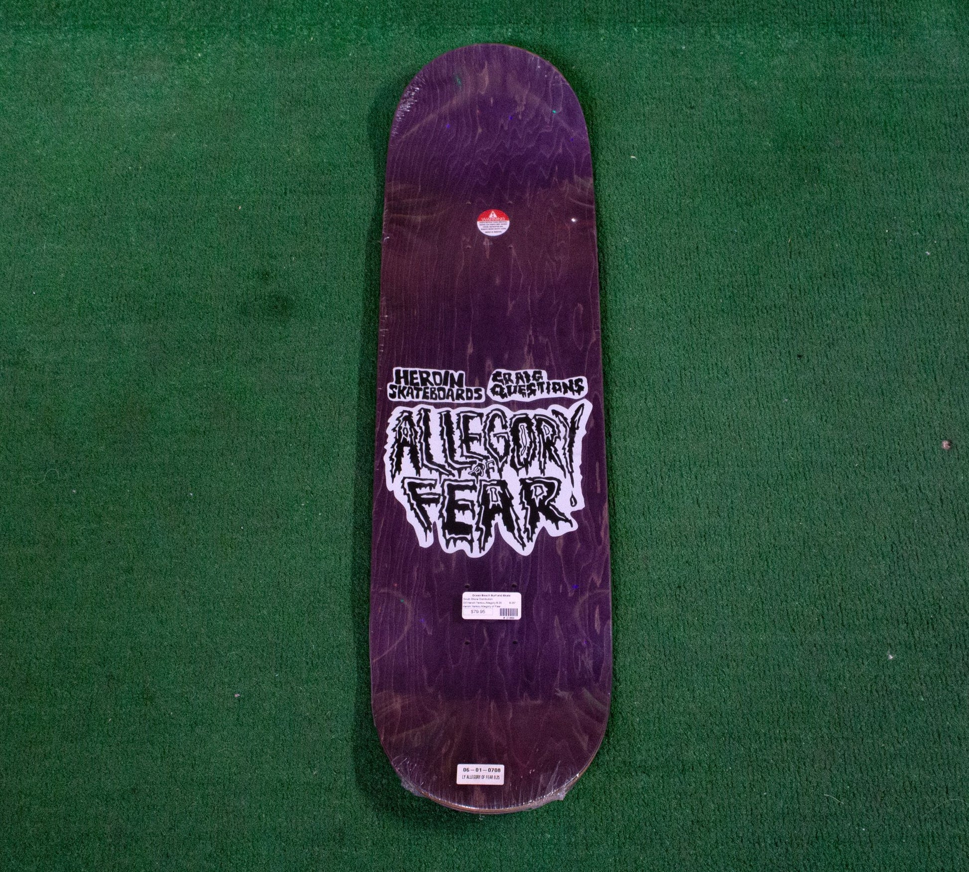 The Heroin Yankou Allegory 8.25 Deck is Lee Yankou’s pro model, built with 7 ply hard-rock maple using Heroin’s razor-edge construction for a sharper boardfeel and consistent pop. It measures 8.25 inches wide, approximately 31.25 inches long, and has a 14.125 inch wheelbase. The deck features a standard popsicle shape with medium concave and displays the “Allegory of Fear” graphic designed by Craig “Questions” Scott.