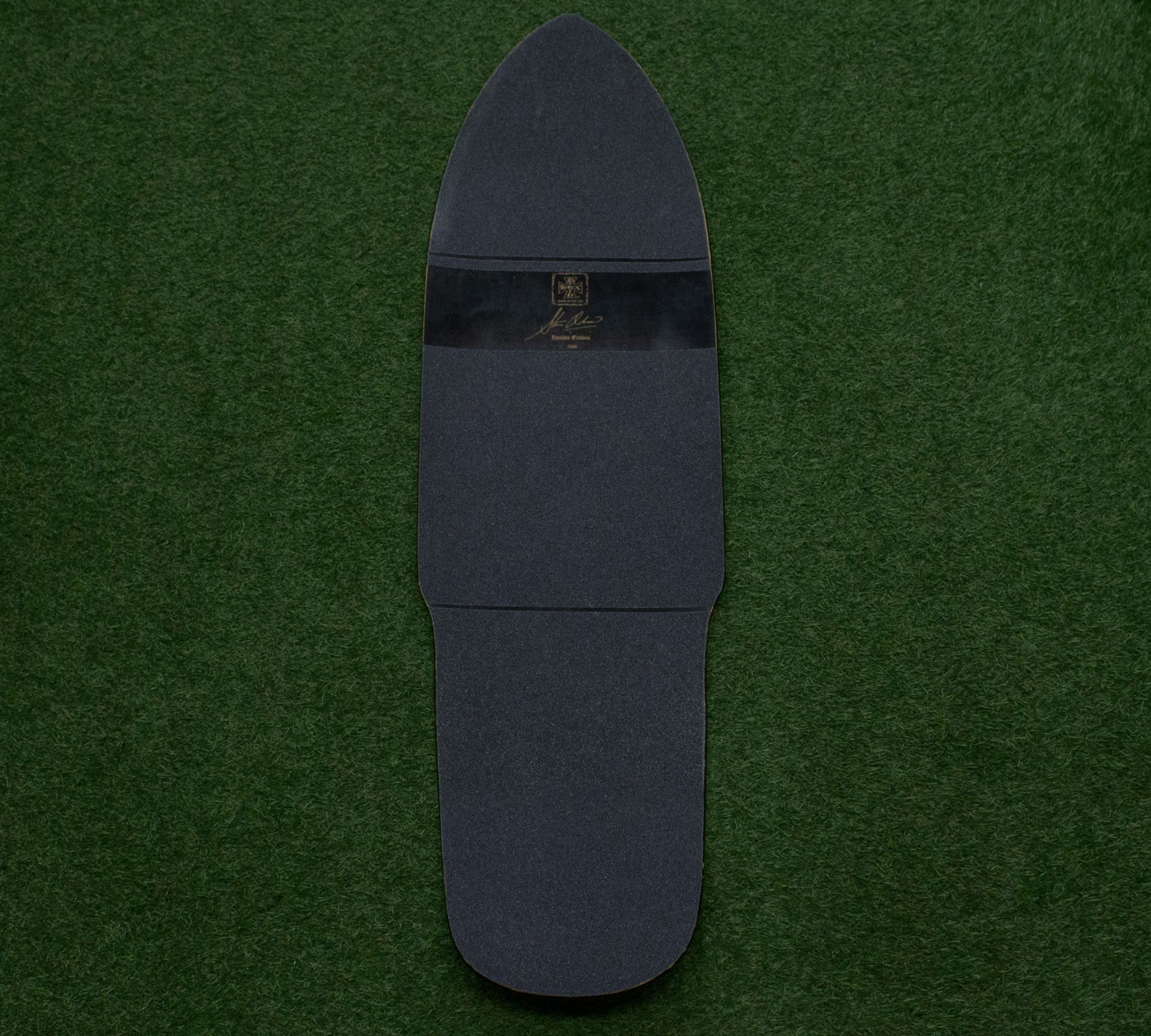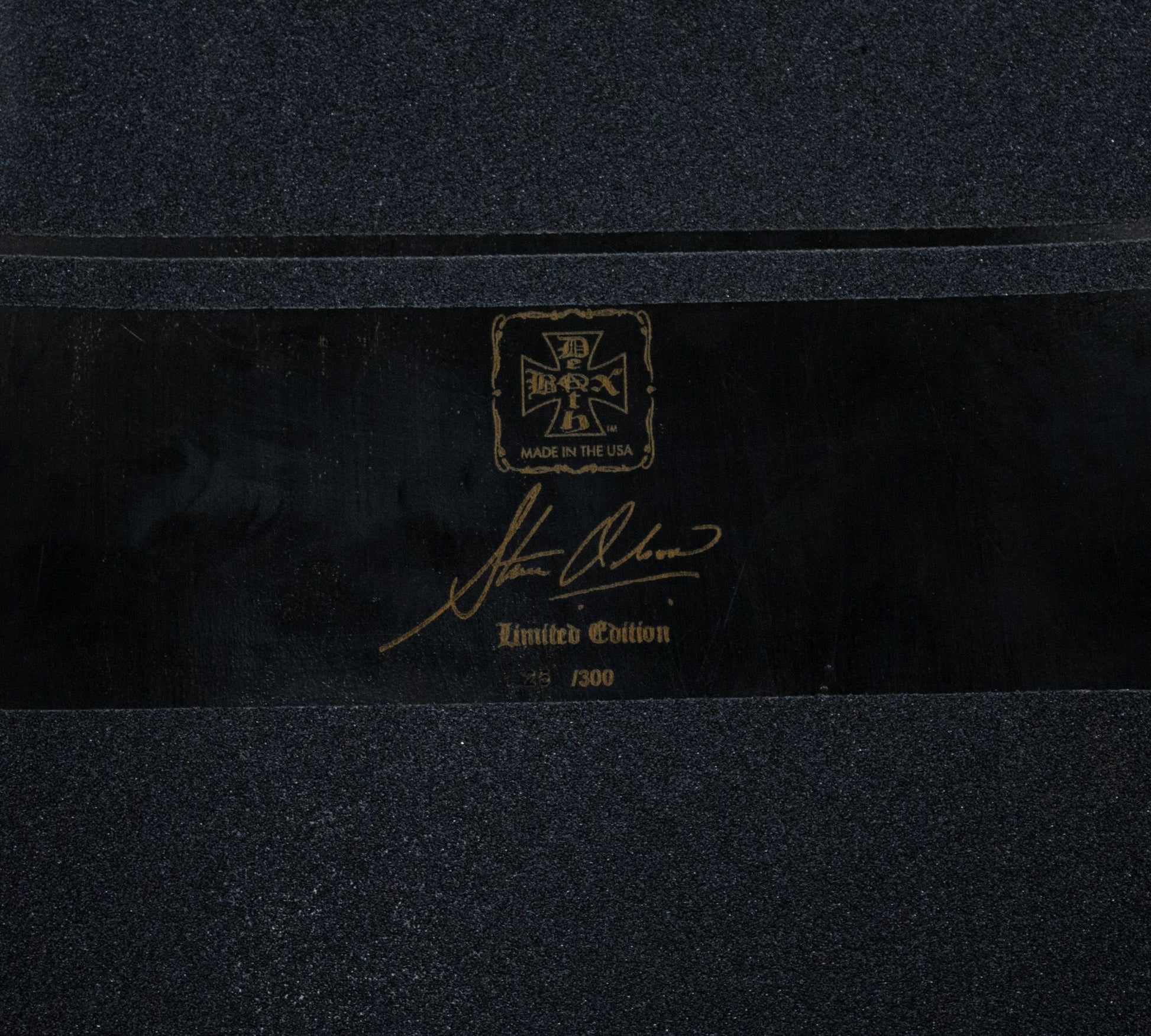 Limited run numbered Olson deck # of 300. Top stamped with Deathbox logo and Steve Olson signature. Bottom is unprinted which indicates a misprint or an unissued production run. Same shape and dimensions as Olson’s Santa Cruz pro model. Suited for collectors or riders who want a wide old school Olson setup.